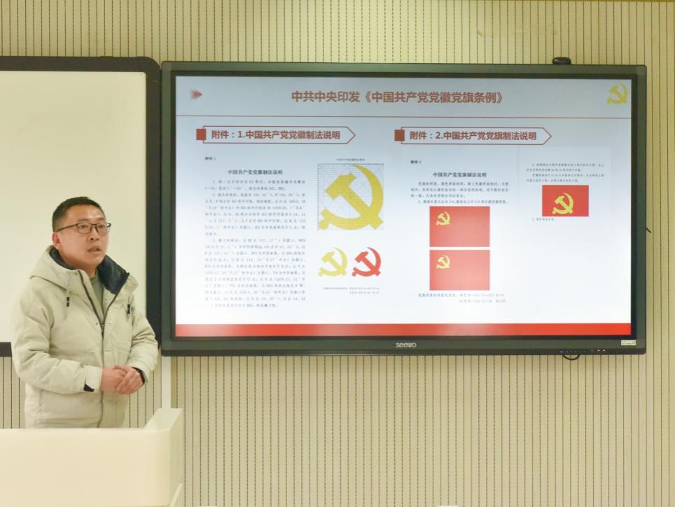 首先,宋海涛同志带领支部党员学习《中国共产党党徽党旗条例》。结合条例中关于“党徽党旗是中国共产党的象征和标志”的表述,他基于共产党的成立和发展历程,梳理了党徽党旗的构成要素的缘起及演变历史,并强调现在党徽是由锤头和镰刀所组成的图标。接着,他从党徽党旗的设计尺寸、组成元素、适用场合等方面系统介绍了该条例的详细条目。