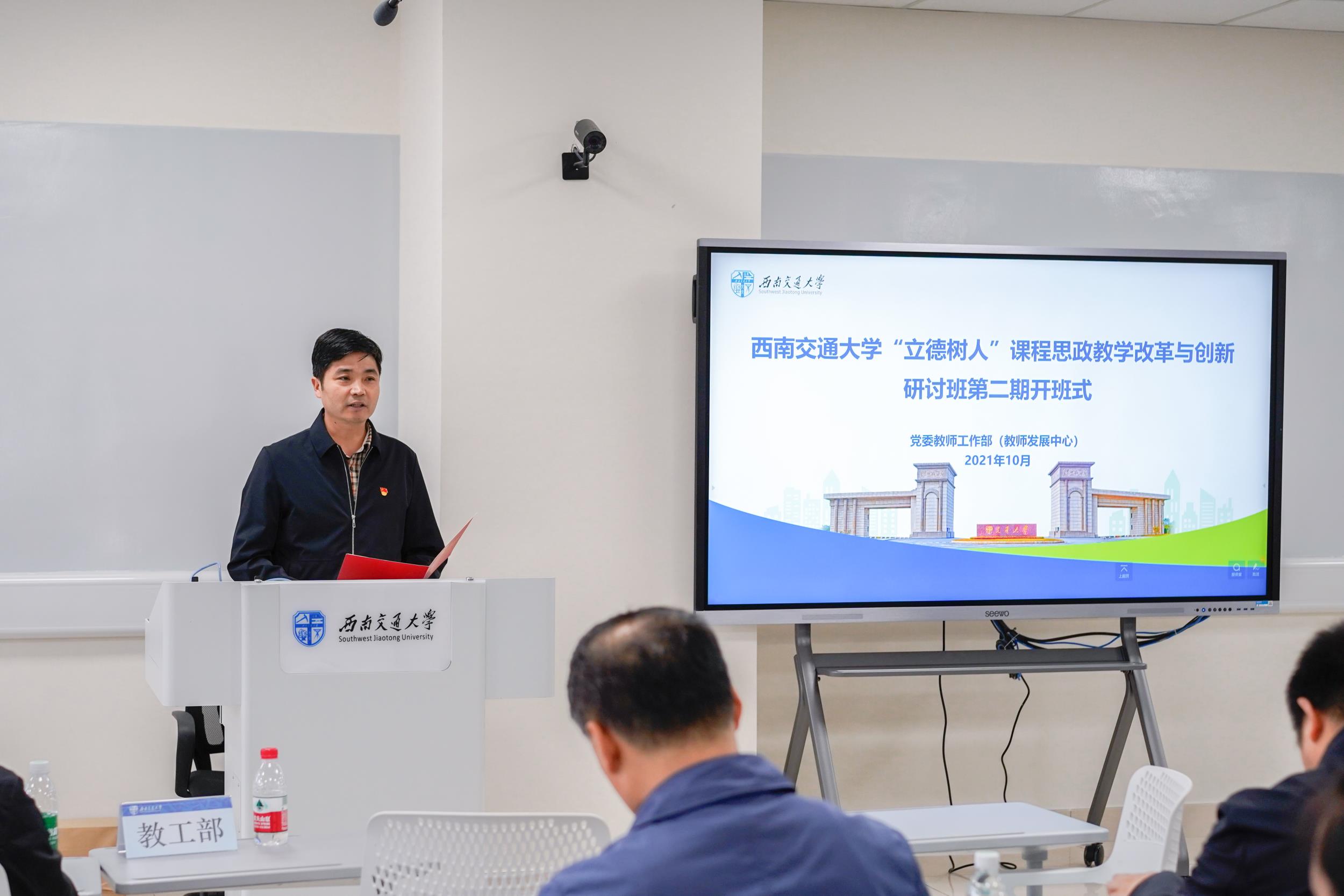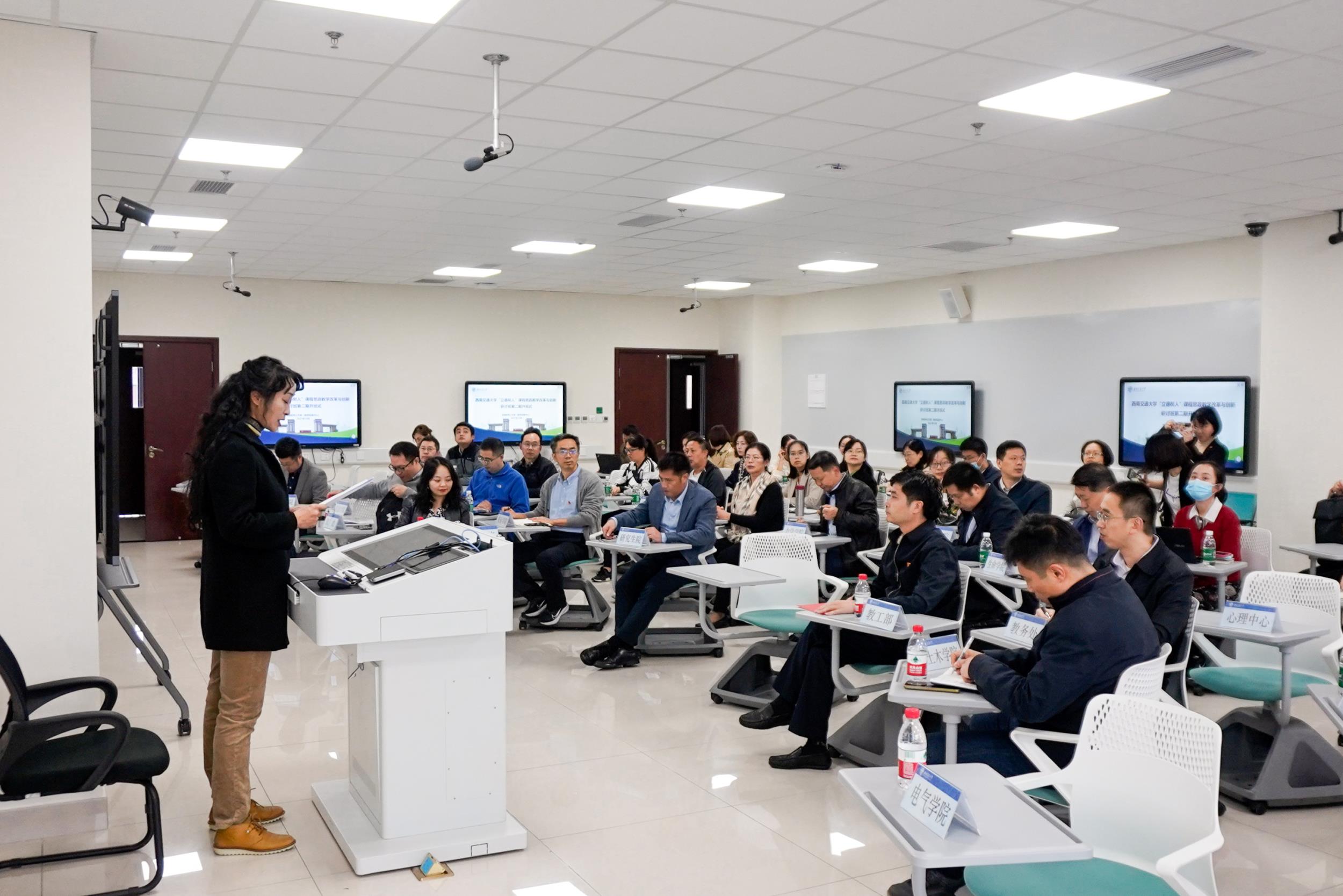 10月12日下午,为庆祝建党100周年,深入贯彻落实党的十九大精神,落实立德树人根本任务,大力推动以“课程思政”为目标的课堂教学改革,使教育教学更有温度、思想引领更有力度、立德树人更有效度,进一步探索课程思政“交大模式”,william威廉英国官网第二期“立德树人”课程思政教学改革与创新研讨班开班式暨首场专题报告在犀浦校区X30517举行。教工部、教务处、研究生院及各教学科研单位领导出席了此次开班式。开班式由党委教师工作部(教师发展中心)副部长李箐主持。