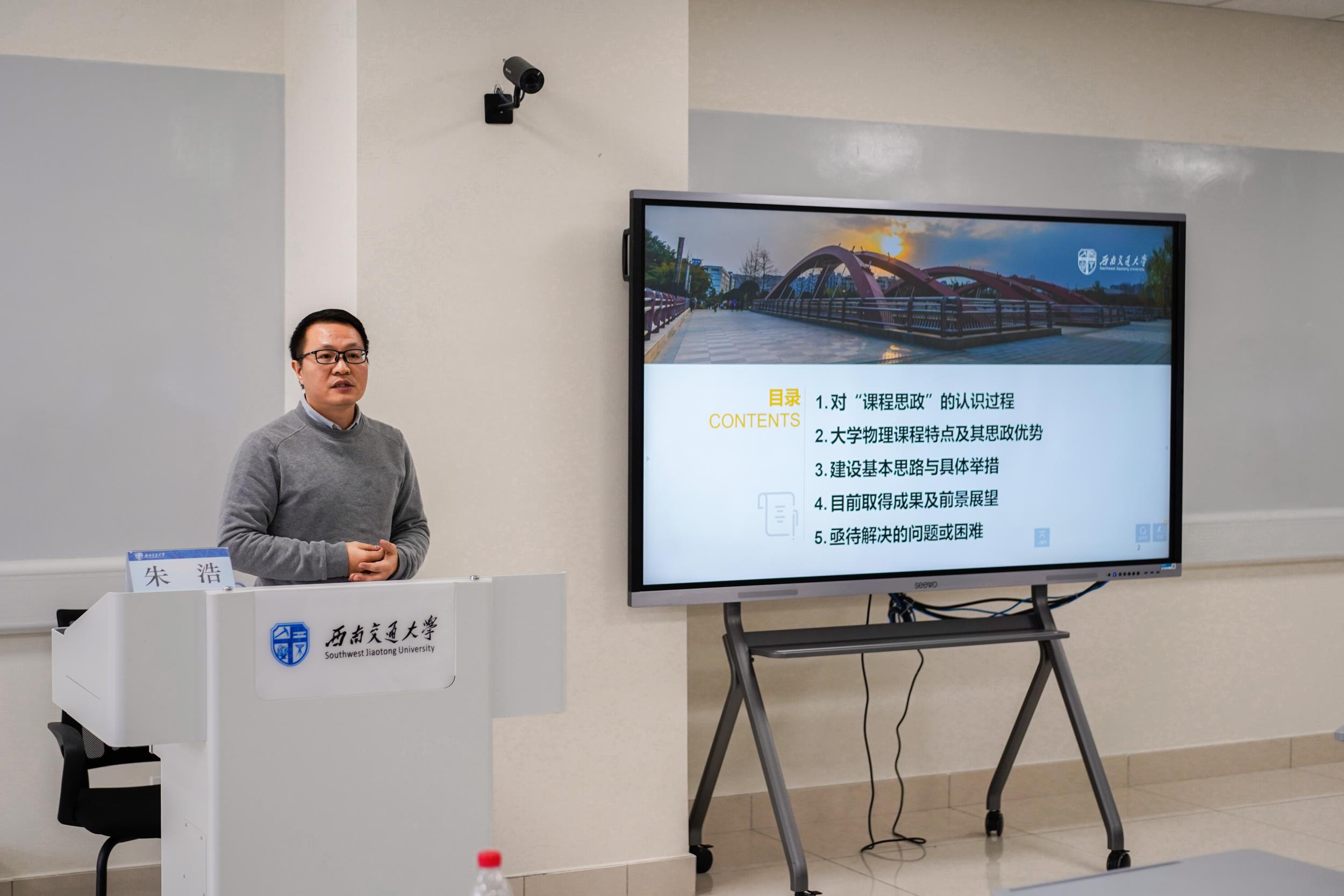接着,物理科学与技术学院朱浩老师做了题为《大学物理课程思政建设探索》的主题报告。朱浩以《大学物理》课程为例,从建设实例出发,分享了理科课程的课程思政建设经验。在他看来,课程思政建设的基本思路与具体举措主要包括“提升教师队伍的思政意识和能力”、“构建课程的课程思政教育体系”、“加强制度保障”三方面内容;在具体的课程教育体系建设中,要从“合理的教育目标出发”,“改革课程内容、嵌入思政元素”,再从“教育过程、教学方法、教学评价”等多角度完善整个教学设计。
